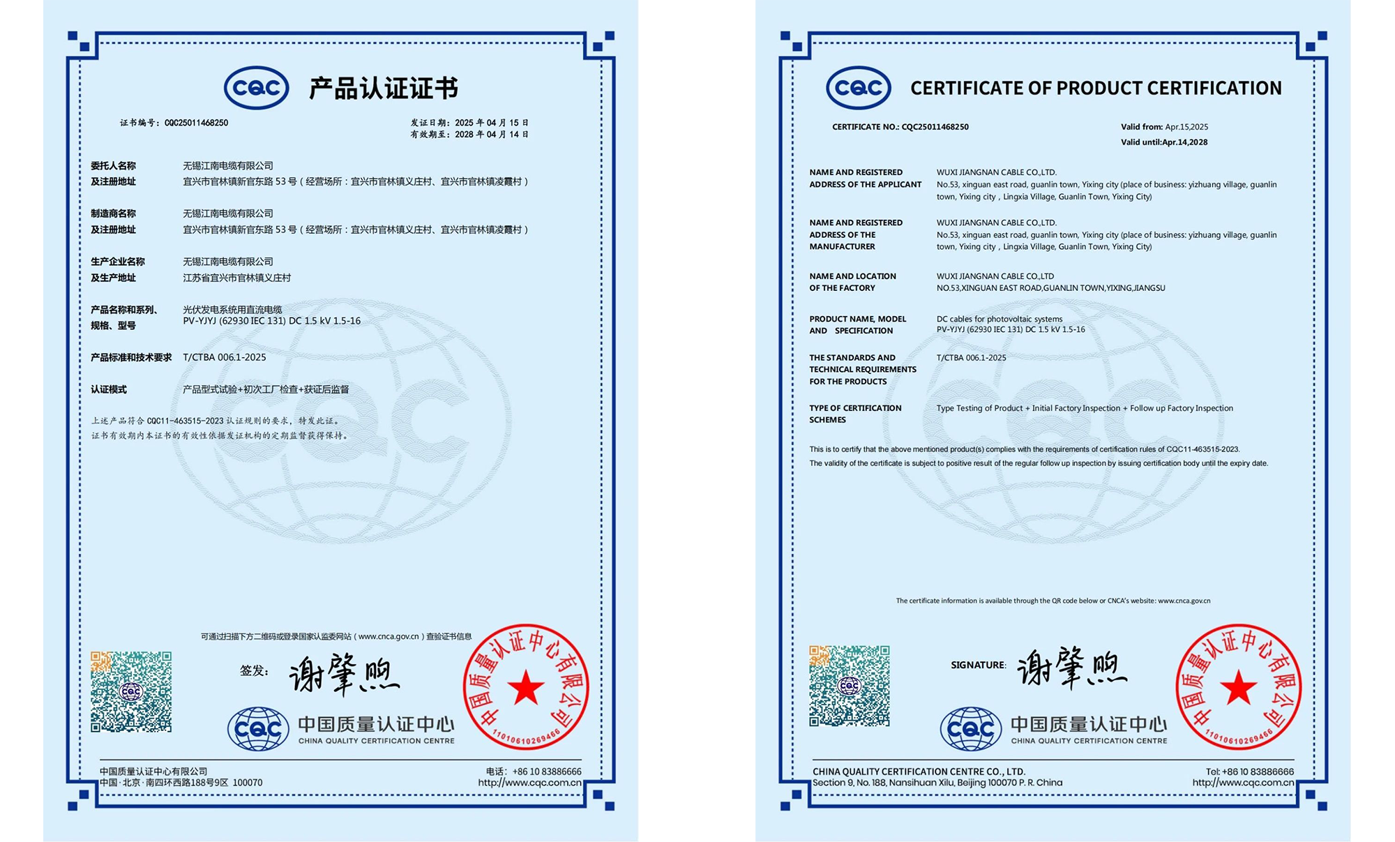 4月18日,江南電纜順利取得CQC頒發(fā)的首批光伏發(fā)電系統(tǒng)用直流電纜PV-YJYJ (62930 IEC131)DC 1.5kV 1.5-16mm2 認證證書。