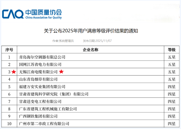 【喜報(bào)】江南電纜榮膺 “用戶滿意五星級(jí)企業(yè)” 稱號(hào)!